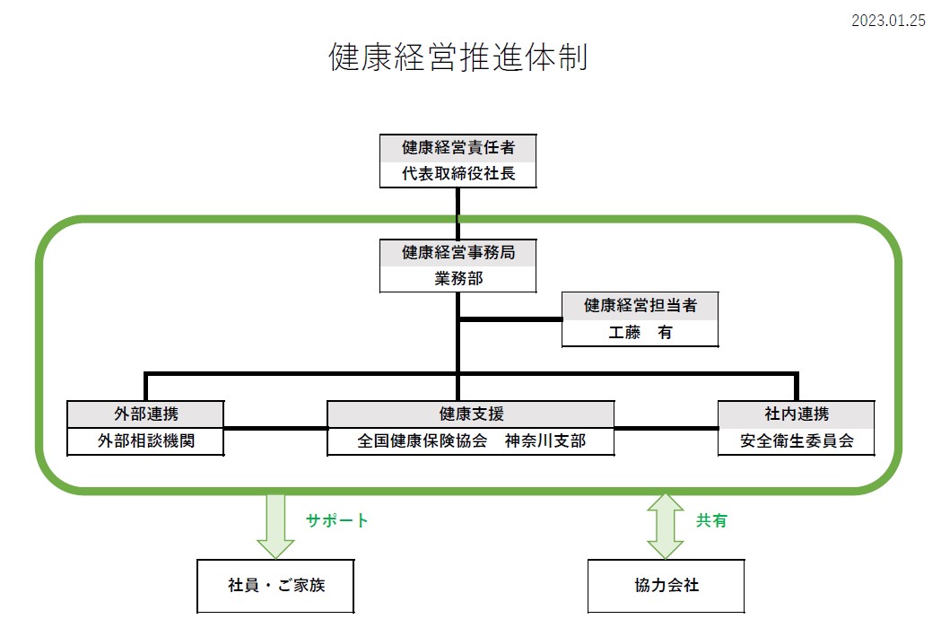 健康経営責任者である代表取締役社長のもと、健康経営事務局である業務部が、健康経営方針について計画・目標を毎年制定します。 また、計画に従って推進された施策の実施内容と検証結果の報告を受けて総括を行い、その結果を健康経営責任者に報告します。